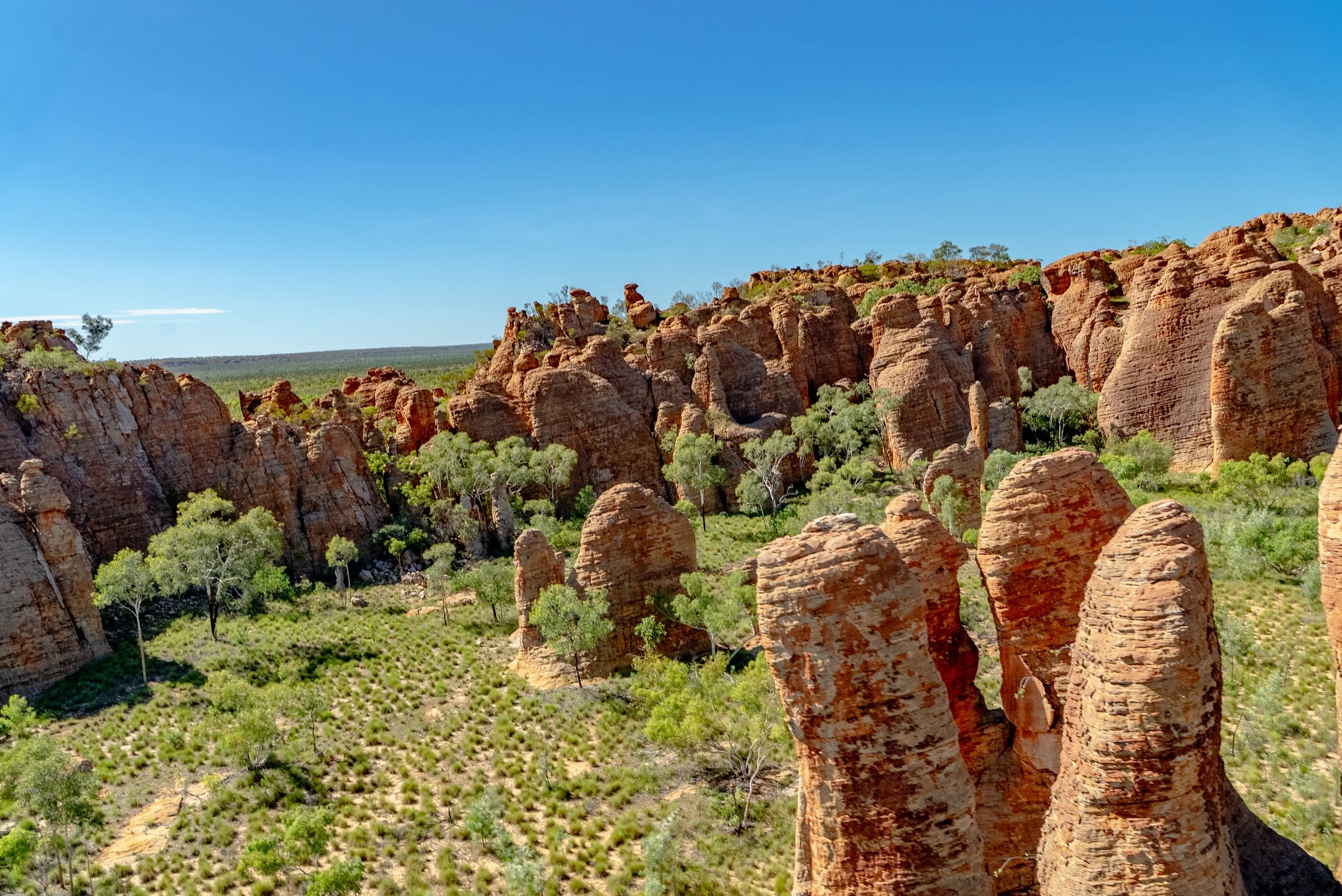 Most visitors who take a tour to the Lost City are outback travellers staying at Heartbreak Hotel in Cape Crawford. The hotel is a great place to stop, grab a meal, and get ready for the helicopter flight to the plateau. Combining a stay at Heartbreak Hotel with a helicopter tour gives travellers a full outback adventure, from the comfort of the pub to the rugged beauty of the Northern Territory bush. From the air, the Lost City is a spectacular and unique sight. The tall sandstone columns rise out of the bush, surrounded by eucalyptus trees and scattered wildflowers. On the ground, visitors notice smaller details such as birds flying overhead, microbats sleeping in secluded crevices, and insects buzzing in the undergrowth. The area feels alive yet peaceful. Clear skies and soft light at this time of year highlight the textures and shapes of the sandstone columns. Every turn reveals something new, whether it is a hidden frog in a crystal clear spring, a flowering shrub, or a bird gliding above the plateau.